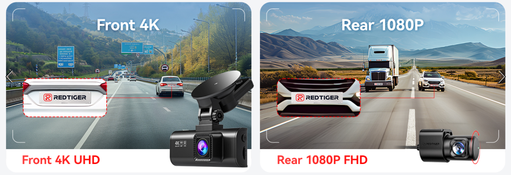 Dual dash cams from REDTIGER can record video in resolutions of up to Full HD 1080P and Ultra HD 4K (3840 x 2160 pixels). It helps you read road signs and important details like vehicle number plates. To reduce blind spots, it has a wide angle of 170 degrees in the front and 140 degrees in the back. This helps you during unexpected circumstances like collision to retain and present evidence.